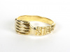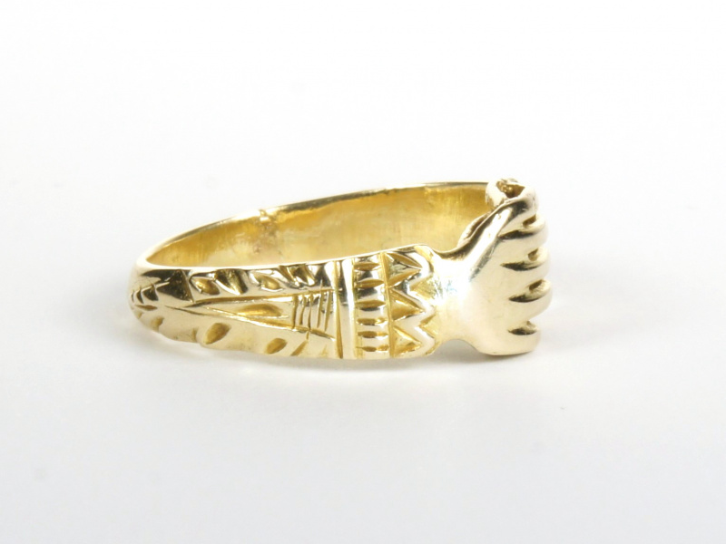 Der vorliegende ästhetische Fede-Ring gibt in der zeitlichen Einordnung einige Rätsel auf. Manschetten und Ärmel sind mit manieristischen Ornamenten geschmückt. Die erste Bordüre, ein scharfes Zick-Zack-Muster, stellt eventuell eine Spitzenborte dar. Darauf folgt eine fein geriffelte Handkrause, die unter einer schlichten Ringborte hervorlugt. Abschliessend, den Ärmel entlang, verläuft ein plastisch ausgearbeitetes Blattdekor mit keilförmigem Muster verziert. Es könnte sich um ein Akanthus-Blatt handeln, welches seit dem 5. Jahrhundert immer wieder als stilisierte, dekorative Verzierung eingesetzt wurde, und in den Mittelmeerländern als Symbol für Leben und Unsterblichkeit galt. Die Gravuren sind handgemacht.